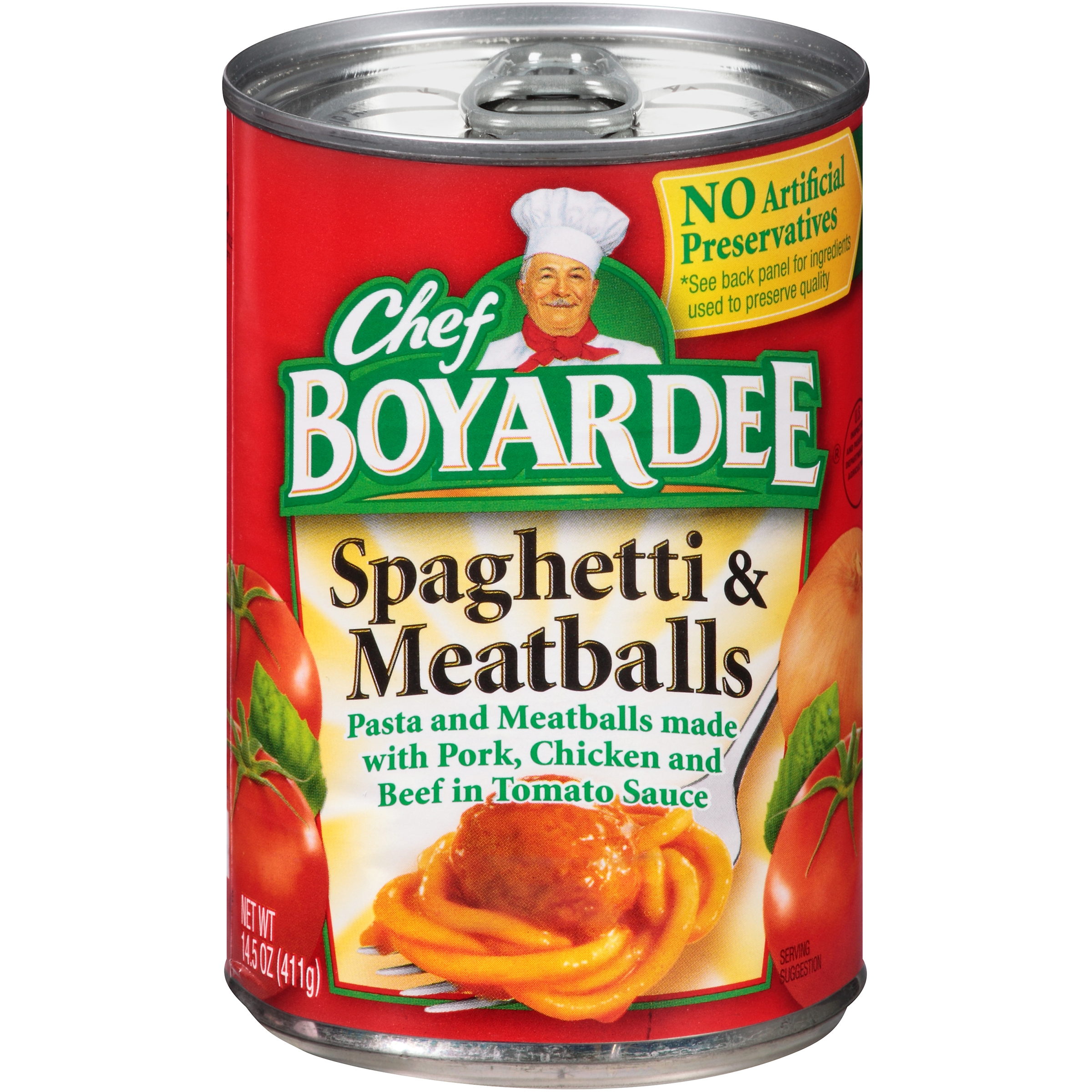 Chef Boyardee Throwback Recipe Beefaroni Pasta in Tomato and Meat Sauce ... Contains twelve 15 oz. Chef Boyardee Throwback Recipe Beefaroni Pasta in Tomato and Meat Sauce Cans ; Enjoy a delectable dish of Chef Boyardee Beefaroni Pasta in Tomato and Meat Sauce for the perfect Italian-style meal in minutes ; Made with delicious California tomatoes, real Romano cheese, and tender Angus beef