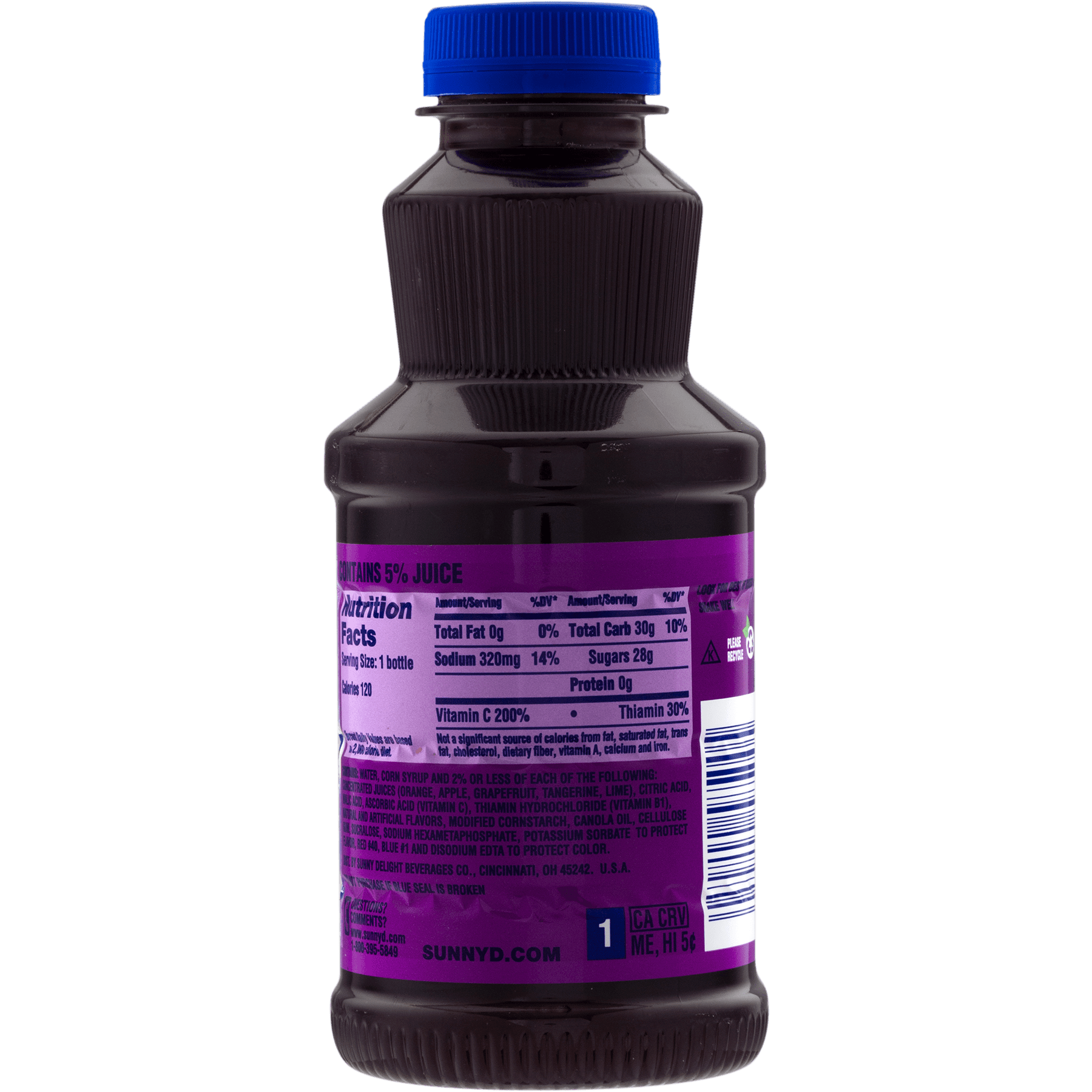 What is the flavor of Sunny Delight? No one seems to know The nutritional label says Sunny D contains 60 calories, 190 milligrams of sodium, 16 grams of carbs and 14 grams of sugar per an 8-ounce serving. On the bright (er, sunny) side, the drink actually...