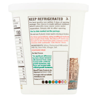 Biazzo Old Fashioned Ricotta Cheese Whole Milk - Instacart Get Biazzo Old Fashioned Ricotta Cheese Whole Milk delivered to you in as fast as 1 hour via Instacart or choose curbside or in-store pickup. Contactless delivery and your first delivery or pickup order is free! Start shopping online now with Instacart to get your favorite products on-demand. Review: USA Made Biazzo Brand Whole Milk Ricotta Cheese Under lid there was a safety sheet of transparent plastic, with very little air between it and the cheese, presumably once open to air, cheese starts to degrade. When "stirred" with spoon it has, when frigerator cold, the consistency of soft ice cream. Light scent and flavour, tastes great on crackers.