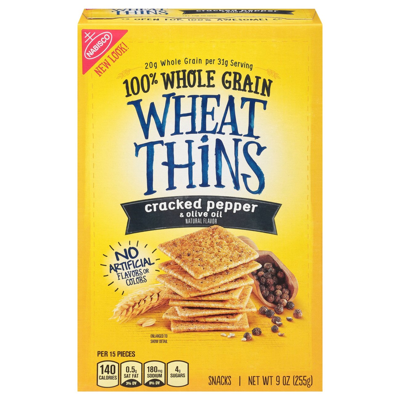 Wheat Thins, Original, 9.1 Oz - amazon.com Wheat Thins are crafted from high quality ingredients and contain no high-fructose corn syrup or cholesterol. They're toasted instead of fried for a nutty crunch that keeps kids and adults coming back for more. Available in Original, Hint of Salt, Multigrain, Ranch, Tomato & Basil, Cracked Pepper & Reduced Fat Product description Wheat Thins Original Whole Grain Wheat Crackers, 24 Total Snack Packs ... Wheat Thins crackers are baked with 100% whole grain wheat to give the whole grain snack cracker a rich, wholesome, salty-sweet taste. ... We recommend that you do not solely rely on the information presented and that you always read labels, warnings, and directions before using or consuming a product. For additional information about a product ... Wheat Thins Original Crackers 9.1 oz Allergy and ... - Allergen Inside Made By: Wheat Thins. SKU/UPC CODE: #440000010492. PRODUCT DESCRIPTION: Contains: wheat, May Contain: does not contain any of the 8 major allergens. INGREDIENTS and MAY CONTAIN STATEMENTS: Signup to Read the Label. It looks like Wheat Thins Original Crackers 9.1 oz is Free From a total of: 9 different TOP 14 Allergens. Wheat Thins Nutrition Facts - Eat This Much Wheat Thins Nutrition Facts - Eat This Much Wheat Thins Zesty Salsa - Nabisco Find on Amazon Percent calories from... Quick stats 140 Calories 22g Carbs (19g net carbs) 4g Fat 2g Protein No price info Try our free Diet Generator I want to eat calories in meals. I like to eat Not the food you're looking for? Try these: Nabisco Ranch Crackers