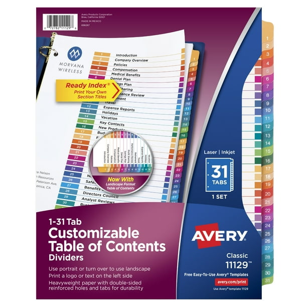 Avery® Ready Index® 20% Recycled Table Of Contents Dividers, 1-31 Tab, Multicolor