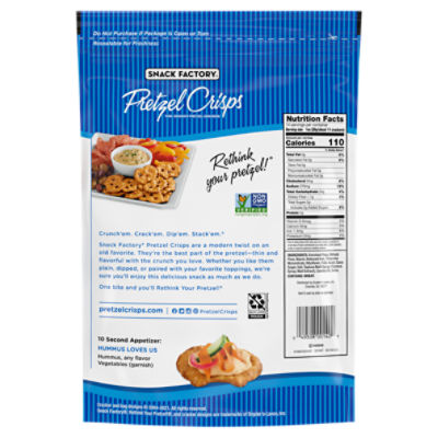 Snack Factory Pretzel Crisps Original Flavor - Campbells Food Service Snack Factory Pretzel Crisps Original Flavor Nutrition Facts are based on our current data. However, because the data may change from time to time, this information may not always be identical to the Nutrition Facts table found on the labels of products. Case Code Original Pretzel Crisps - Pretzel Crisps It's like you wished for the perfect snack … and that wish came true! Perfectly salted Original Pretzel Crisps® give you that satisfying, hearty crunch in a versatile shape that's dippable, spreadable and deliciously snackable. Available in 7.2oz, 3oz, 1.5oz and 14oz party size Nutrition Facts & Ingredients Where to Buy slide 2 to 4 of 3 Garlic Parmesan Pretzel Crisps® - Pretzel Crisps Garlic Parmesan Pretzel Crisps® slide 3 of 2 Garlic Parmesan Pretzel Crisps® are just like our Original Pretzel Crisps®, but all fancied up with savory garlic and zingy Parmesan for big flavor in a crunchy snack. Available in 7.2oz, 3oz, 1.5oz and 14oz party size Nutrition Facts & Ingredients Where to Buy YOU MAY ALSO LIKE slide 2 to 4 of 3 Calories in Snack Factory Pretzel Crisps, Original - CalorieKing There are 110 calories in 1 11 crackers (1 oz) of Snack Factory Pretzel Crisps, Original. You'd need to walk 31 minutes to burn 110 calories.