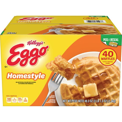 Amazon.com: Eggo Frozen Waffles, Frozen Breakfast, Resealable ... Includes one, 12.3-ounce box containing 10 waffles. Deliciously crispy and fluffy, our Eggo Homestyle Waffles are crafted with delicious ingredients. Pop these frozen waffles in the toaster or oven for a delightfully crisp texture and the familiar, inviting taste of homemade waffles.
