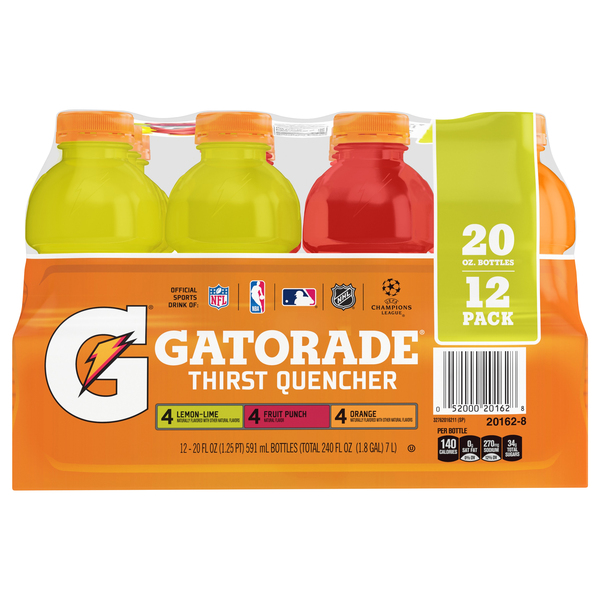 Gatorade Orange Thirst Quencher 20 oz Bottles Gatorade Orange Thirst Quencher 20 oz Bottles 8 pk $6.67 ($0.05/oz) Icon details Product description When you sweat, you lose more than water. You also lose critical electrolytes, like sodium and potassium, which help regulate fluid level balance throughout the body. Muscles rely on fluid and fuel to thrive on the field.