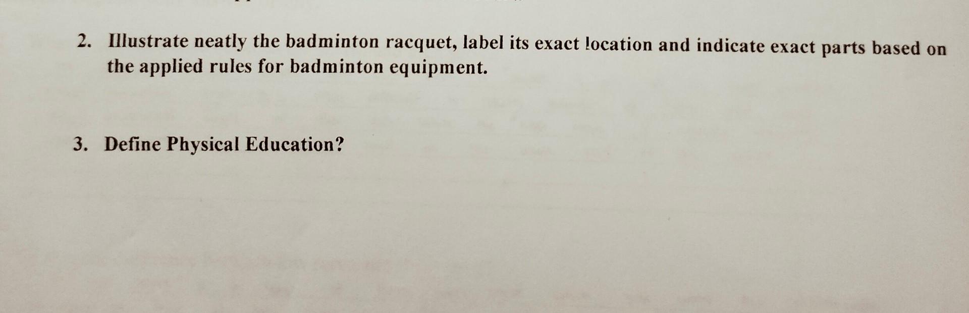 Activity 1: Draw and label the parts of a badminton racket. Activity 1: Draw and label the parts of a badminton racket. Pay nasagutan nyo to bigyan kita braintest answer Dapat mo I drawing mo pls Tama dapat Advertisement Loved by our community 108 people found it helpful mik12mikaellaMich Head Stringed Area Throat Frame Shaft Handle ty ok lang Badminton - WE ARE EDUCATORS Oct 2, 2017 ... 1. Racket – Badminton racket is quite light and can be made of wood. · PARTS OF THE RACKET · 2. Shuttlecock – is the official name given to the ... Label the parts of the Badminton Racket? - Brainly.ph Label the parts of the Badminton Racket? - 23355840 deguzmansophia391 deguzmansophia391 10.12.2021 Physical Education Junior High School answered Label the parts of the Badminton Racket? 2 See answers Advertisement ...