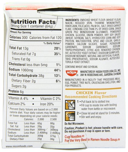 Cup Noodles, Ramen Noodle Soup, Chicken Nutrition Facts Calories, carbs, fat, protein, fiber, cholesterol, and more for Cup Noodles, Ramen Noodle Soup, Chicken (Nissin). Want to use it in a meal plan? Nissin Cup Noodles Chicken Flavor Noodle Soup - H-E-B Trans Fat, 0g ; Cholesterol, 0mg, 0% ; Sodium, 1070mg, 45% ; Total Carbohydrate, 42g, 14% ... The Original Cup Noodles Nutrition Facts - Eat This Much Nissin ; How many calories are in The Original Cup Noodles? Amount of calories in The Original Cup Noodles: Calories 290, Calories from Fat 99 (34.1%) ; % Daily ...