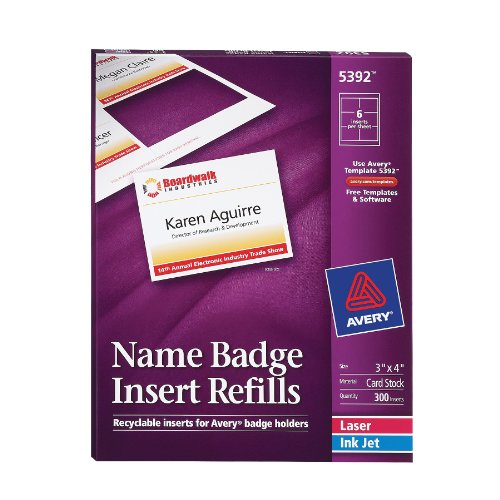 Avery 5392 Name Badge Insert Refills, White, 3" x 4", Sheet of 6 ... Create professional looking name badges for your next event · Easily identify employees and visitors during multi-day meetings, seminars, parties, events and ...